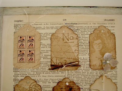 I attached a piece of vintage French dictionary page to painted a canvas board and mounted the tags on top. It was a fun project - now I just need to find it a home in my house!